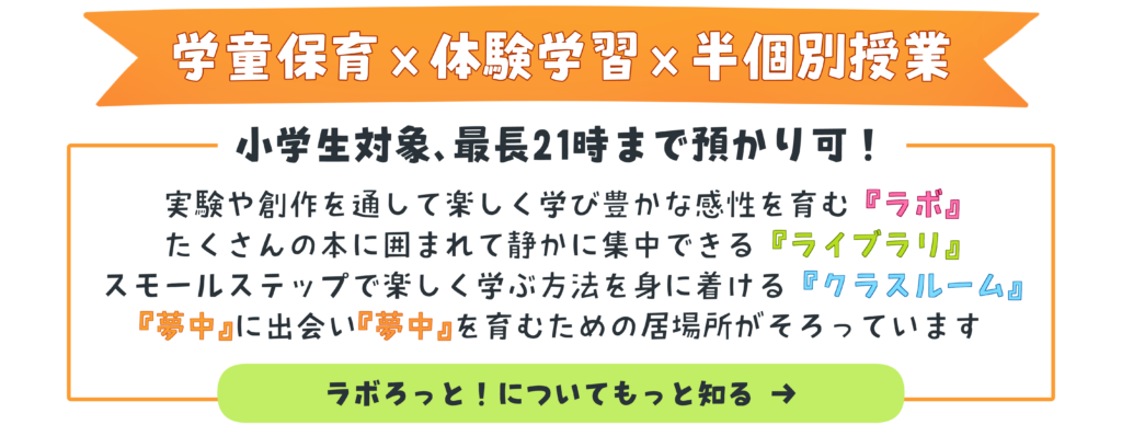 ラボろっと!の提供する『学童保育×体験学習×半個別指導』すべてを兼ね備えたプランです!
